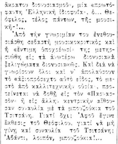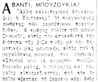 Την επόμενη κιόλας μέρα του εκθειαστικού για τον Τσιτσάνη άρθρου της Σπανούδη, η ΕΣΤΙΑ εκφράζει τις αντιρρήσεις της (ΕΣΤΙΑ 2/2/1951)