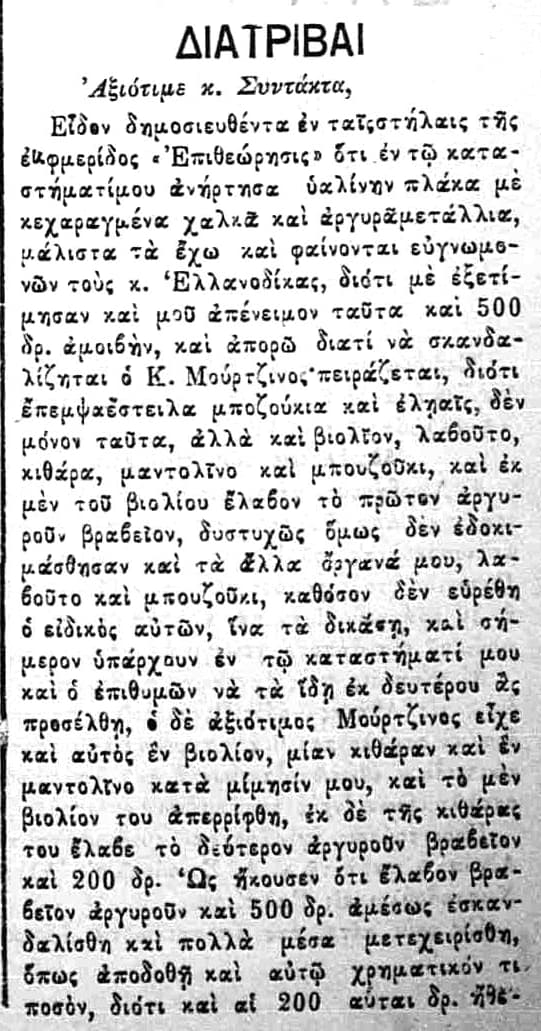 Εδώ του απαντά ο Μούρτζινος (ΕΦΗΜΕΡΙΣ 23/1/1890, «Κύριε Διευθυντά της Εφημερίδος»)