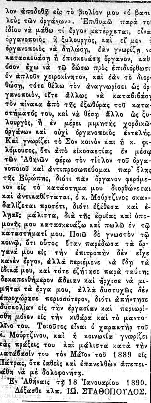 Σταθόπουλος εναντίον Μούρτζινου (ΚΑΙΡΟΙ 20/1/1890)