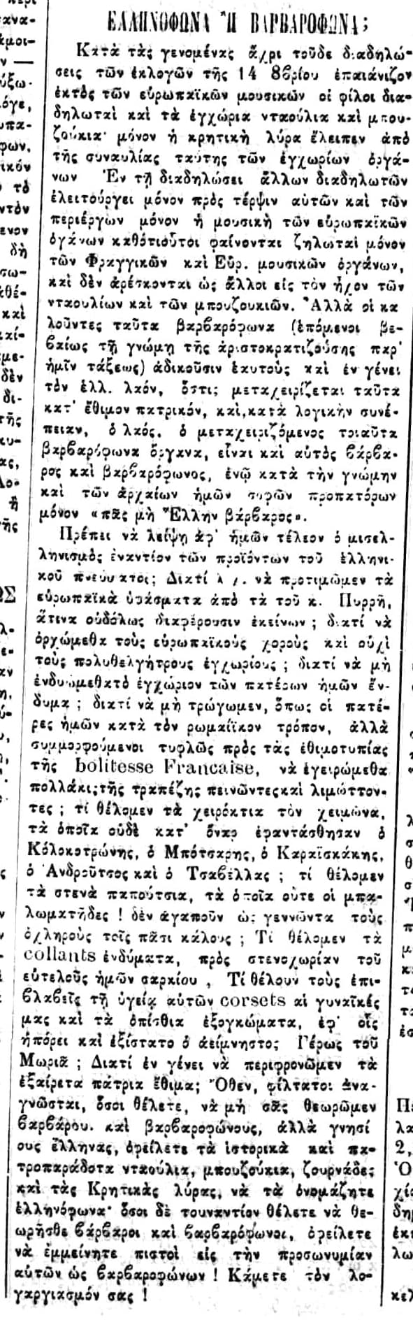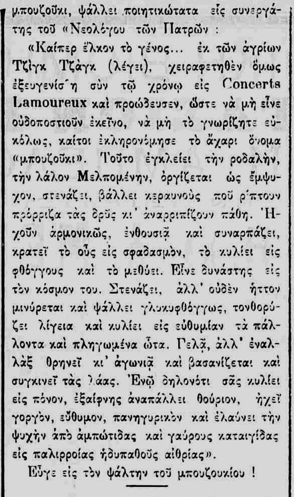 Κάνοντας λοιπόν τη σχετική πλάκα της η εφημερίδα ΑΙΩΝ (9/9/1850) γράφει για τα μουσικά όργανα: