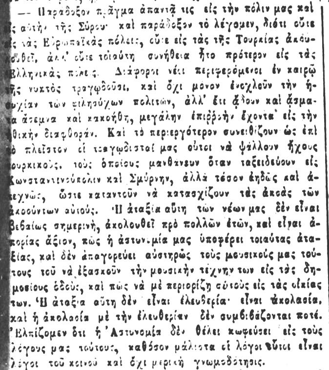 Τι άσματα άσεμνα και κακοήθη σε τουρκικούς ήχους να τραγουδούσαν οι νέοι στους δρόμους το 1857 άραγε; (ΑΘΗΝΑ 13/2/1857)