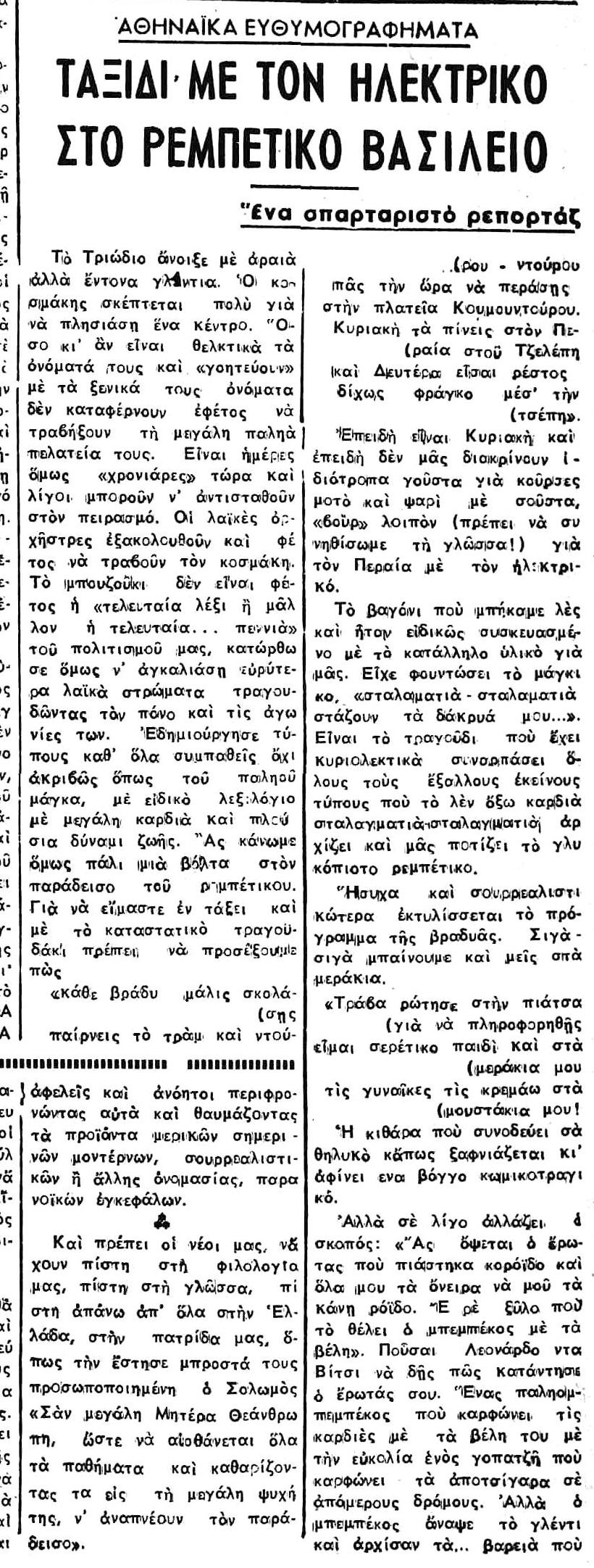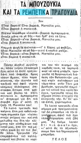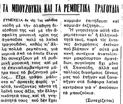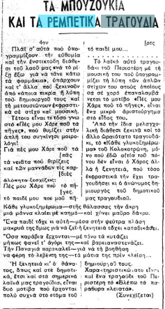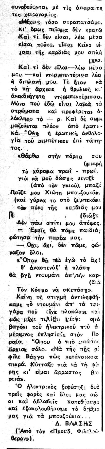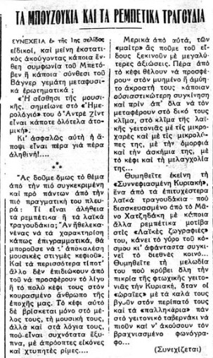 «Αλλ’ ο γράφων τας γραμμάς ταύτας δεν αισθάνεται ούτε τον ελάχιστον δισταγμόν να διακηρύξη δημοσία ότι, μεταβαίνων εις το Καφέ-Αμάν για να ακούση το τραγούδι του Αλήπασσα, αισθάνεται πολύ περισσοτέραν ηδονήν παρά εάν ήκουε όλους του Βάγνερ τους ρυθμούς και όλες τις Καβαλλερίες Ρουστικάνες […]»