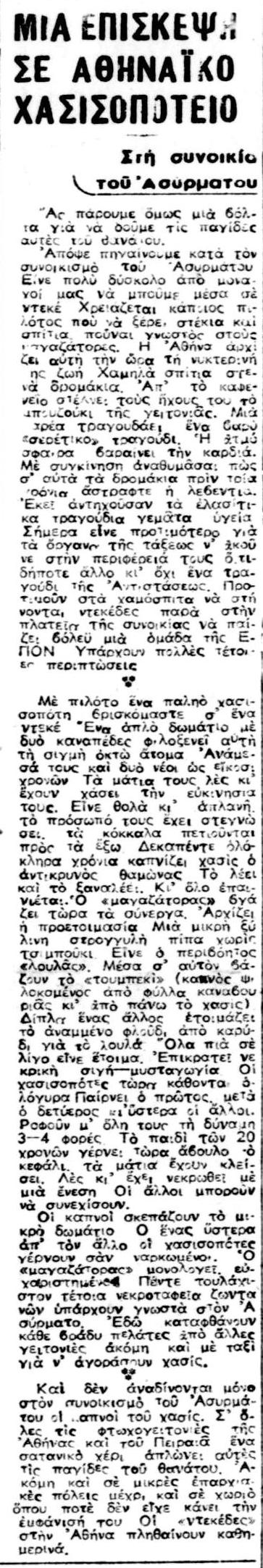 Από ρεπορτάζ της αριστερής εφημερίδας ΕΛΕΥΘΕΡΗ ΕΛΛΑΔΑ (11-18/10/1946) για τους τεκέδες στη μεταπολεμική Ελλάδα:
