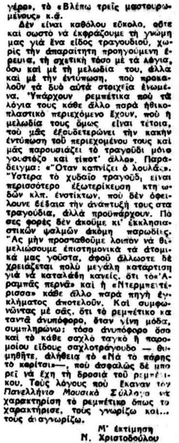 «Κατόπιν διαταγής του αρχηγού του Γ.Ε.Σ., απηγορεύθη από τριημέρου η μετάδοσις λαϊκών τραγουδιών από τον Ραδιοφωνικόν Σταθμόν Ενόπλων Δυνάμεων. Το απαγορευτικόν μέτρον πρόκειται να επεκταθή επίσης και εις τον Σταθμόν Αθηνών. Ως εγνώσθη, η απόφασις ελήφθη κατόπιν αλλεπαλλήλων παραπόνων ακροατών του Σταθμού και με σκοπόν να δοθή εις το πολύ κοινόν μουσική ποιότητος. Σημειωτέον ότι το μέτρον θίγει ιδιαιτέρως τα συμφέροντα των συνθετών λαϊκής μουσικής, οι οποίοι και ετοιμάζουν κατόπιν τούτου ομαδική διαμαρτυρίαν.»