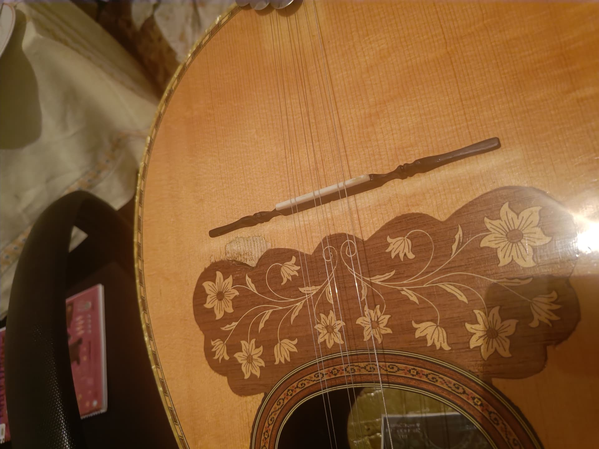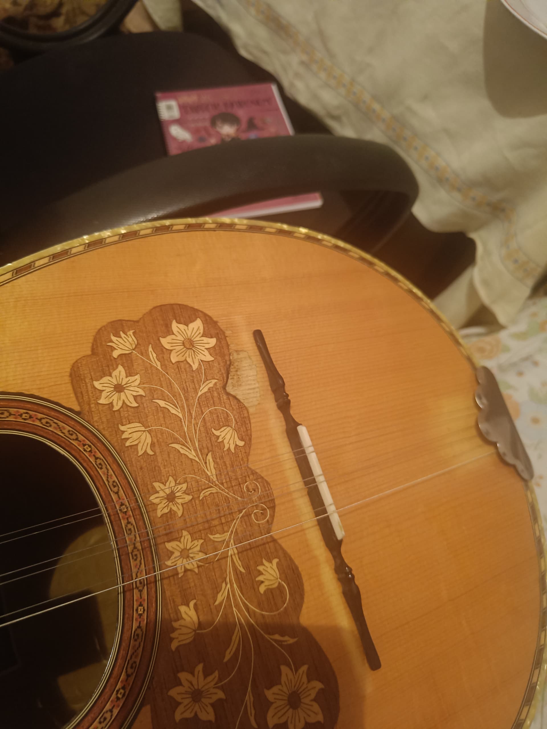 η αποχρωση απο τον καβαλαρη δεν ειναι τιποτα, μην ασχολησε καν, φυσιολογικο ειναι. ισα ισα που ειναι καλο να το βλεπεις που μπαινει ο καβαλαρης οταν θα αλλαζεις χορδες, η σου φυγει καμια φορα. στο αλλο, εκει που ειναι το φαγωμα, εγινε απο το μικρο δαχτυλο απο το νυχι, απο το παιξιμο. φτιαχνεται. πηγαινε στο μαστορα. η θα σου βαλει σκονη τριμενο ελατο με κολλα, η ξυλοστοκο ιδιου χρωματος και απο πανω βερνικι παλι. η σου βαζει ενα κομματακι ξυλο οπως και της φιγουρας, αλλα δεν θα φαινεται ομοιομορφο…