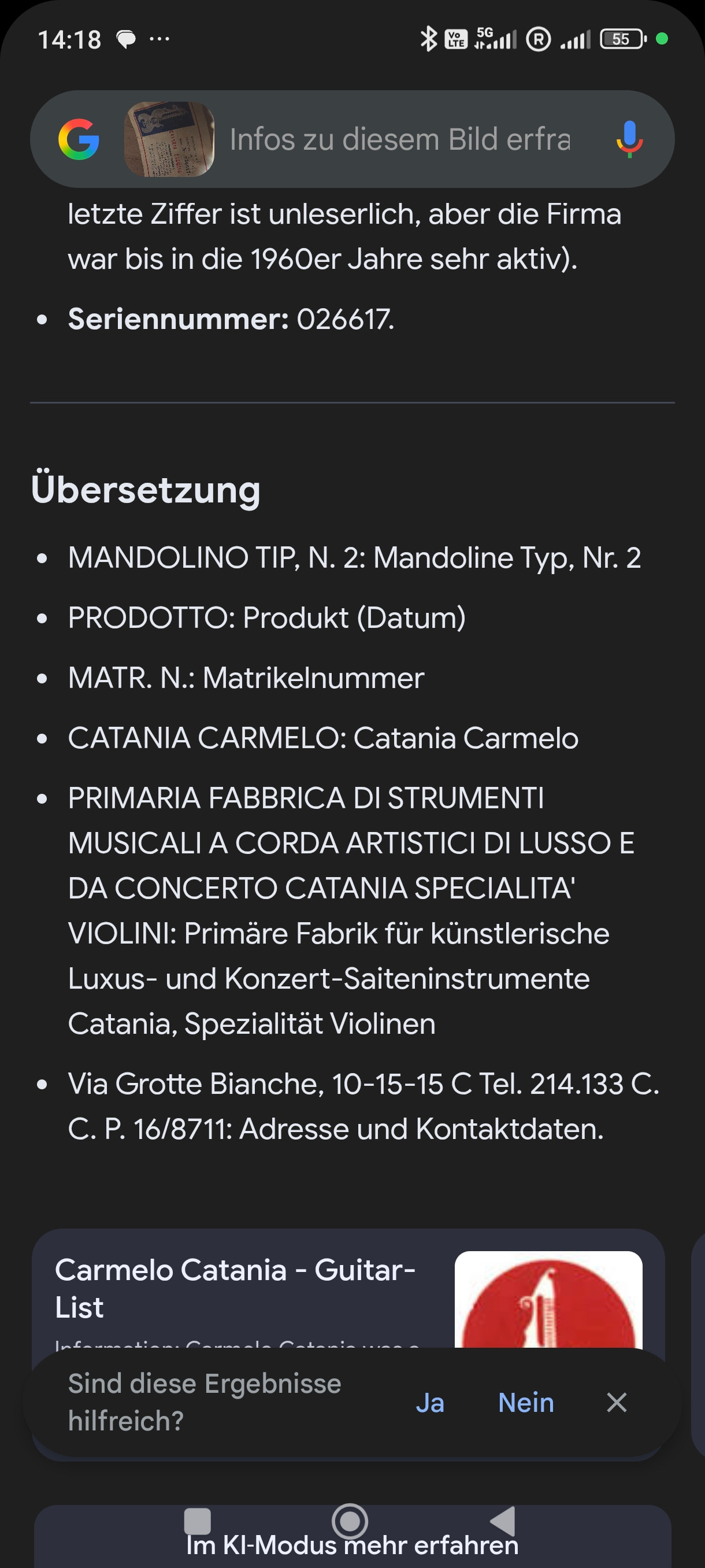 Από την έρευνα που έκανα κατάλαβα ότι έχει καλά ξύλα αλλά δεν ξέρω κατά πόσο αξιζει η επένδυση. Τα περισσότερα της συγκεκριμένης εταιρείας είναι μαντολίνα ενώ τρίχορδο δεν κατάφερα να βρω. Προφανώς θα γινόντουσαν παραγγελία από Ελλάδα. Ο άνθρωπος που μας έδωσε το οργανο είναι αδερφός από αυτόν που το είχε αγοράσει το 1966 και το είχε παρατημένο από τότε καθώς είχε φύγει Αμερική.
