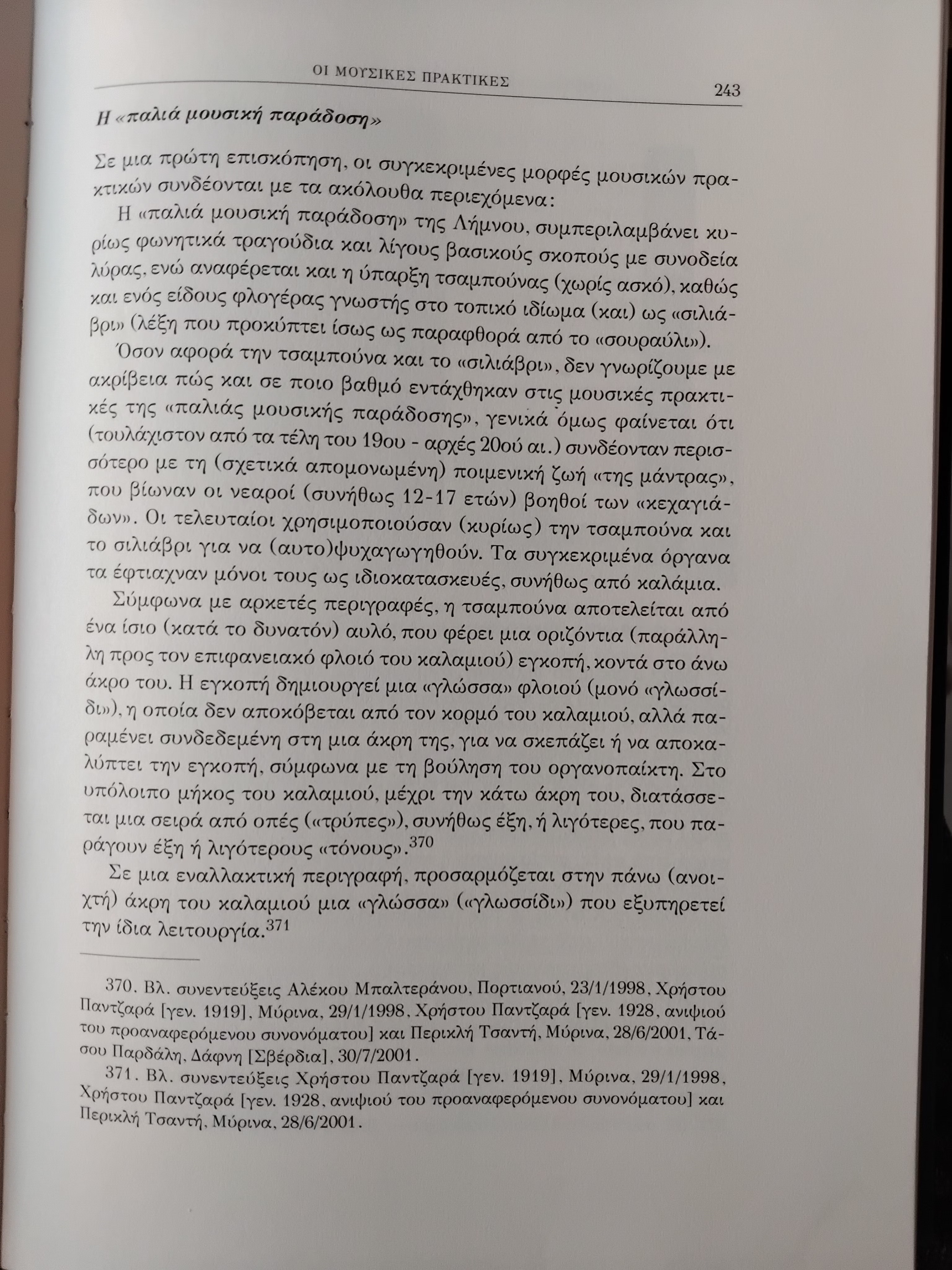 Παραθέτω τη σελίδα τίτλου με τα πλήρη στοιχεία της έκδοσης, και στη συνέχεια την αναφορά στην τσαμπούνα, που βρίσκεται στις σελ. 243 και 244 της ενότητας «Οι μουσικές πρακτικές»: