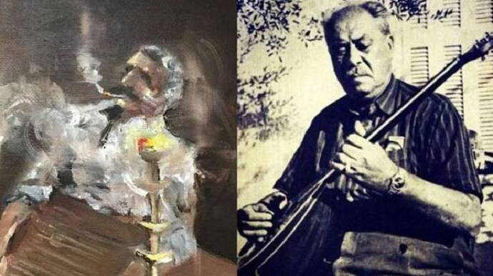 «Μία άλλη ζωγραφιά εις τον αντικρυνό τοίχο επαράσταινε μέγα δένδρο, πολύκλωνο και πλατύφυλλο, που το εκλόνιζε η ριπή δυνατού ανέμου, και στη ρίζα του ξαπλωμένος ένας φουστανελοφόρος με το μουστάκι περήφανα στριμμένο, με το σκυλί στα πόδια του και το γιογκάρι στα χέρια εφαίνετο ότι έπαιζε και ετραγουδούσε.
