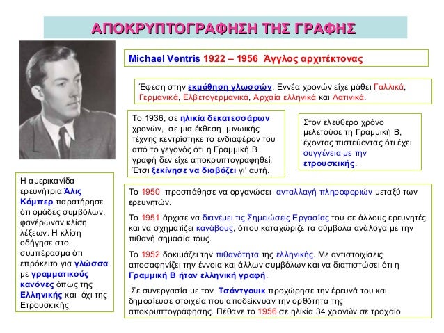 Ο Μάικλ Βέντρις. Στην ιδιοφυΐα του οφείλουμε τη γνώση ότι η ιστορία τής ελληνικής γλώσσας δεν αρχίζει πλέον τον 8ο αιώνα αλλά από τα μέσα τού 15ου αιώνα