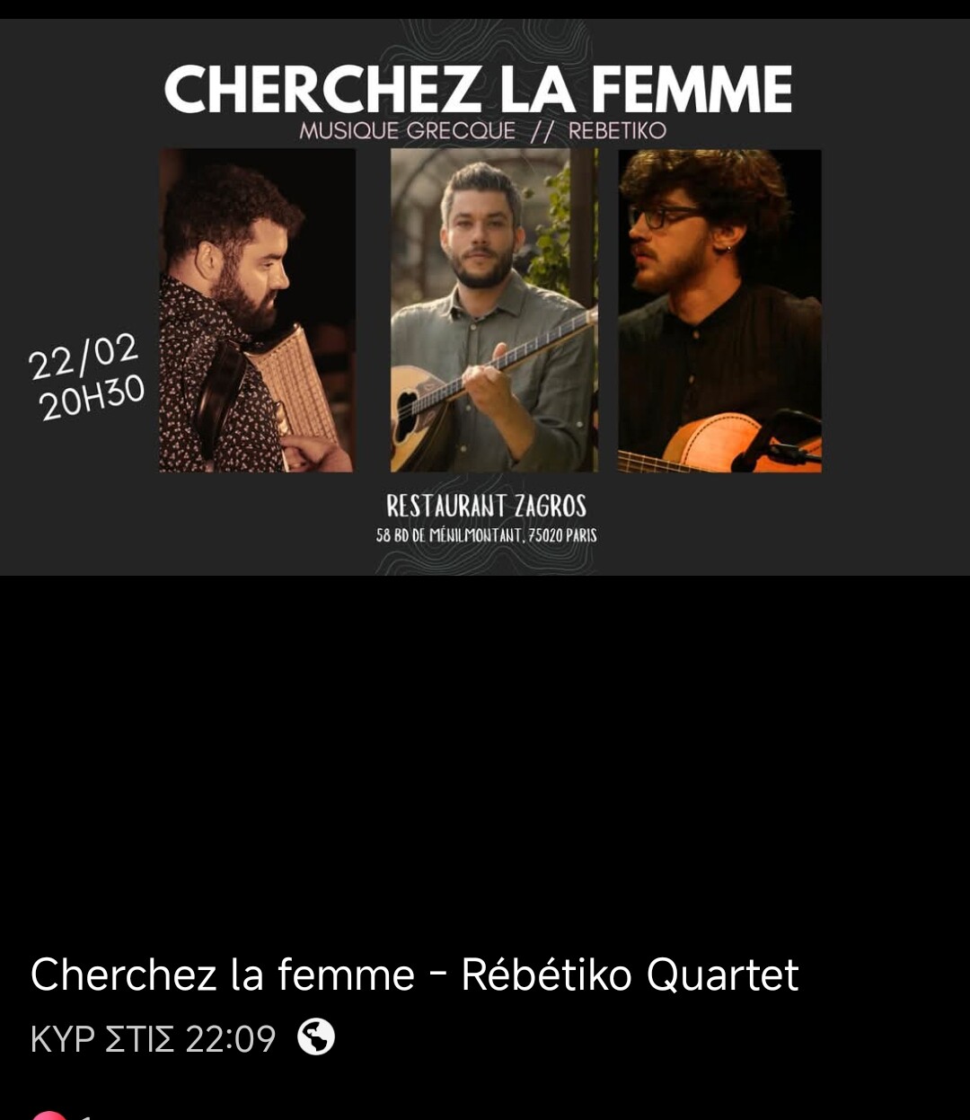 Οι cherchez la femme εξαιρετικό γκρουπ, τους έχω ακούσει πολλές φορές. Και το στέκι που παίζουν εξαιρετικό επίσης, έχω πάει πολλές φορές και έχω παίξει και εγώ!