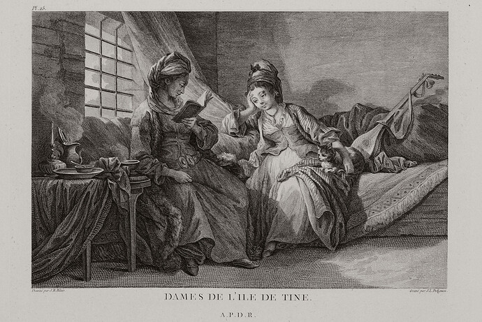 Μία εικόνα από το 1782, από το βιβλίο Voyage pittoresque de la Grèce του Γάλλου Choiseul-Gouffier. Ο Choiseul-Gouffier έκανε ένα ταξίδι στην Ελλάδα το 1776, όπου μάλλον συνάντησε τις κυρίες της Τήνου: