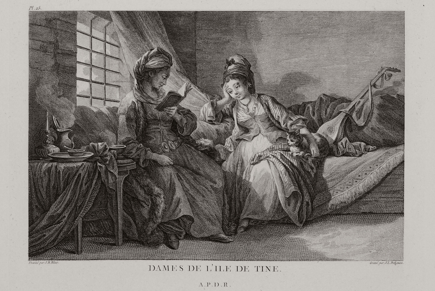The musical instrument shown in “Dames de l’Ile de Tine” sets new challenges for research. The object may be identified as a stringed, pear-shaped tambouras, a member of the lute family that was widely used in pre-revolutionary Greece. The neck of such an instrument would typically be straight, but there were also cases of a slanted neck, similar to that of a lute, as is the case of the tambouras shown in this image.The tambouras was usually played without the support of other instruments and produced a “thin” and relatively weak sound that was particularly appropriate for accompanying singing or dancing by a small group. Consequently, tambouras music playing was more fitting to interior spaces; it would therefore suit women who were for the most part living in their private quarters.