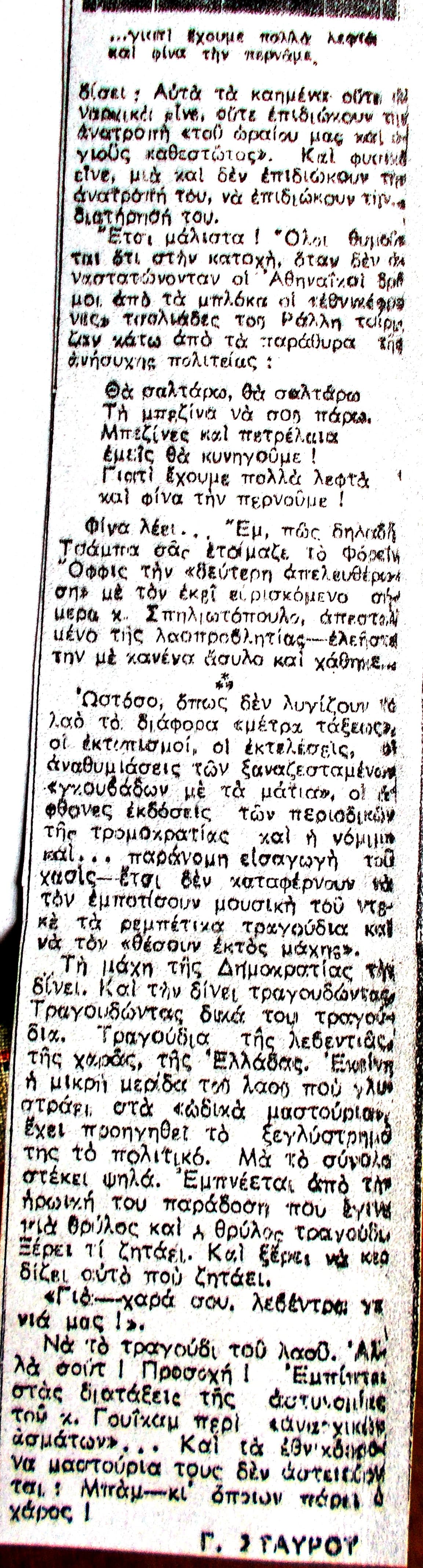 Να βάλουμε και το πρώτο άρθρο για το ρεμπέτικο που δημοσίευσε η Αριστερά (27/11/1946) μέσα από την εφημερίδα ΕΛΕΥΘΕΡΗ ΕΛΛΑΔΑ, η οποία αποτελούσε " Όργανο του πολιτικού συνασπισμού των κομμάτων του ΕΑΜ":
