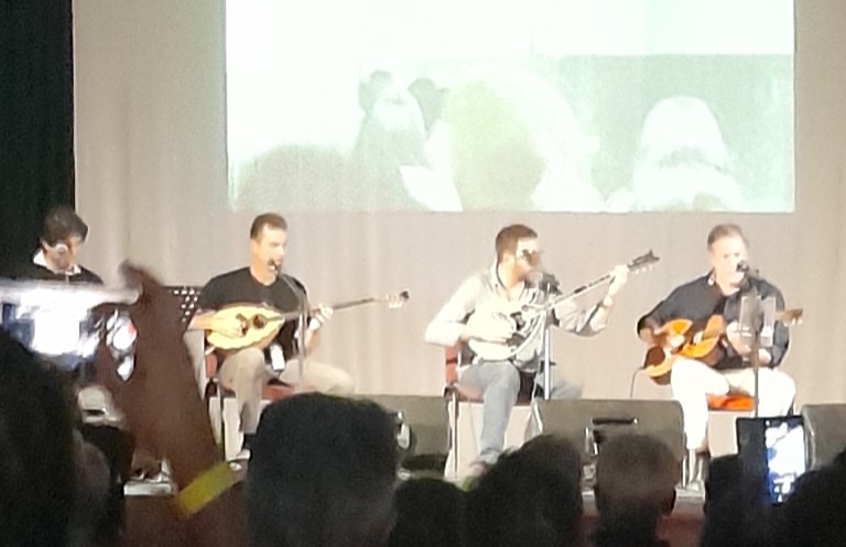 ANTIFA was Janni Tsiantis, Tasos Kaklamanis (both from the organisation team) and right Jorgos Zorbas, they played political Rebetika, against war, crisis, hunger, antidemocratic movements … for example, they played CHAIDARI and presented pictures by beamer.